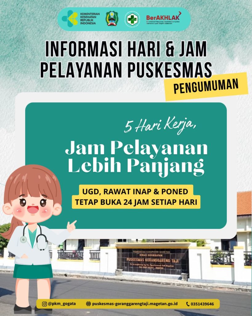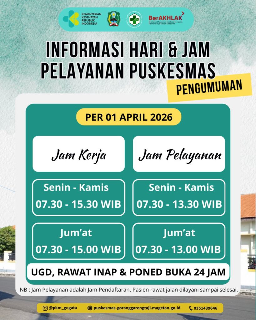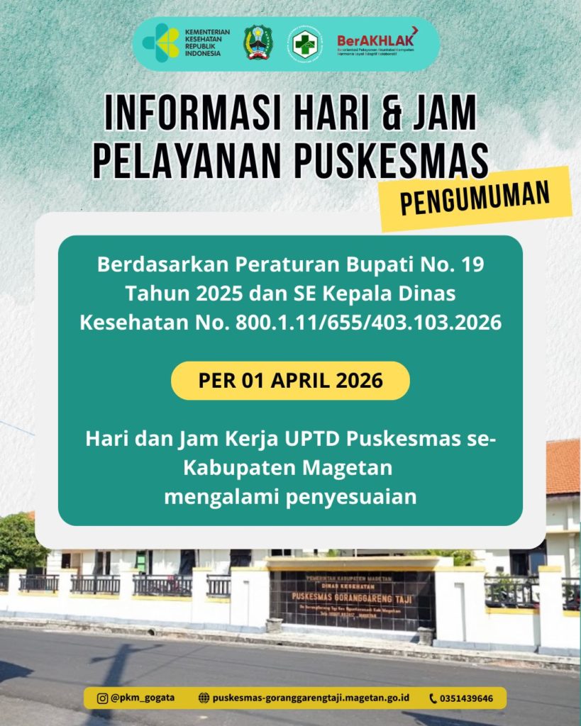 Berdasarkan Surat Dinas Kesehatan Kabupaten Magetan Nomor 800.1.11/655/403.103/2026 tanggal 4 Maret 2026 tentang Hari dan Jam Kerja Aparatur Sipil Negara (ASN) di UPTD Puskesmas se-Kabupaten Magetan, terdapat perubahan hari kerja dan jam pelayanan di Puskesmas.