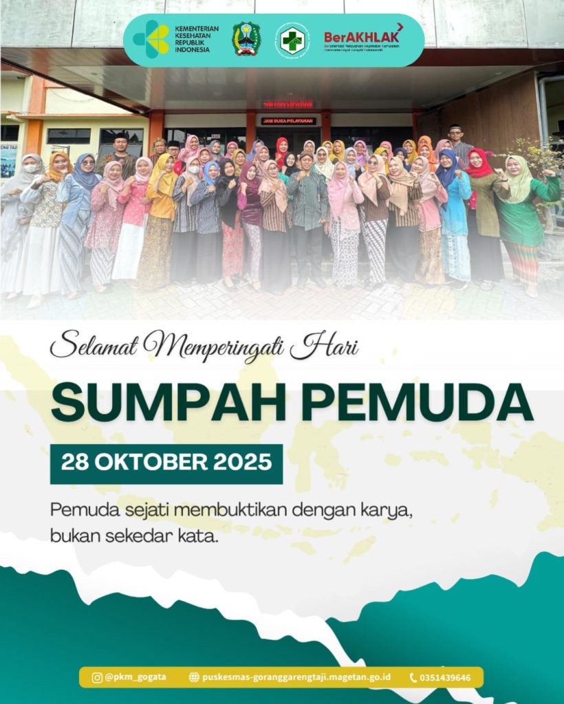 29 Okt 2025 admin 0 Komentar PERINGATAN HARI SUMPAH PEMUDA Halo #TonggoGogataKeluarga Besar UPTD Puskesmas Goranggareng Taji mengucapkan Selamat Memperingati Hari Sumpah Pemuda Tahun 2025.Sumpah Pemuda 28 Oktober bukan sekedar peringatan sejarah, tetapi panggilan untuk terus berkarya dan berkontribusi bagi negeri.Salam,Stay Safe, Stay Healthy